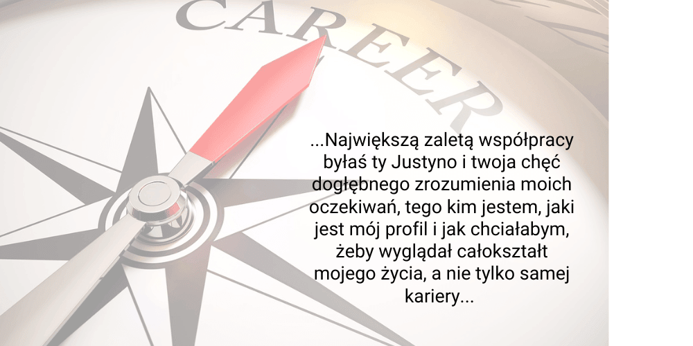 Największą zaletą współpracy byłaś ty Justyno i twoja chęć dogłębnego zrozumienia moich oczekiwań, tego kim jestem, jaki jest mój profil i jak chciałabym, żeby wyglądał całokształt mojego życia, a nie tylko samej kariery. Poza tym to zdecydowanie narzędzia, test, który użyłyśmy i potem wspólna analiza wyników były również bardzo pomocne. Podobało mi się to, że byłam w stanie ustalić, jakie są moje wartości w pracy i życiu, jakie środowisko pracy do mnie pasuje. Do tej pory miałam mętlik w głowie na ten temat (…)
