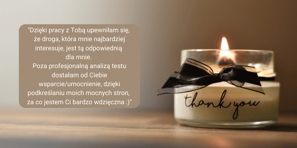 Dzięki pracy z Tobą upewniłam się, że droga, która mnie najbardziej interesuje, jest tą odpowiednią dla mnie. Poza profesjonalną analizą testu [Kompas Kariery] dostałam od Ciebie wsparcie/umocnienie, dzięki podkreślaniu moich mocnych stron, za co jestem Ci bardzo wdzięczna :)